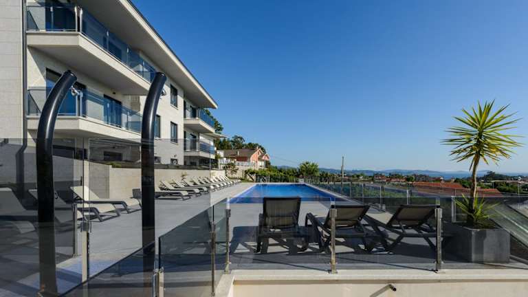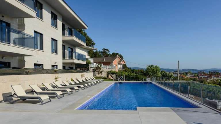 Die Apartamentos Onzamar in Sanxenxo bieten Ihnen einen komfortablen und angenehmen Aufenthalt in der Nähe des Strandes Panadeira. Mit einem Außenpool, einem schönen Garten und einer Gemeinschaftslounge können Sie hier entspannen und den Urlaub in vollen Zügen genießen. Die klimatisierten Unterkünfte sind geräumig und bieten alles, was Sie für einen gelungenen Aufenthalt benötigen, darunter ein eigenes Bad, einen Flachbild-TV, kostenfreies WLAN und eine komplett ausgestattete Küche. Von der Terrasse aus haben Sie einen schönen Blick auf den Pool. Eine Sonnenterrasse und eine Waschmaschine stehen Ihnen ebenfalls zur Verfügung. Der Flughafen Vigo ist nur 25 km entfernt.