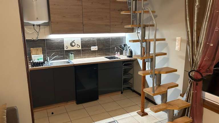 Die Unterkunft bietet eine voll ausgestattete Küchenzeile mit Kühlschrank und Herdplatte, die den Gästen die Möglichkeit gibt, selbst zu kochen. Grilleinrichtungen sind ebenfalls vorhanden.
