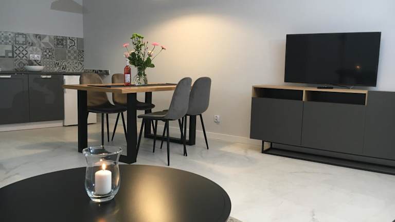 Die klimatisierten Unterkünfte im Apartamenty Centrum sind modern und komfortabel eingerichtet und bieten den Gästen ein angenehmes Ambiente. Die Wohneinheiten verfügen über Fliesenböden und sind mit einer voll ausgestatteten Küche ausgestattet, die einen Kühlschrank, einen Geschirrspüler, ein Kochfeld, einen Toaster und einen Wasserkocher umfasst. Es gibt auch einen gemütlichen Essbereich und ein eigenes Badezimmer mit einer Dusche und einem Haartrockner. Zusätzlich gibt es einen Flachbild-Kabel-TV für Unterhaltung.