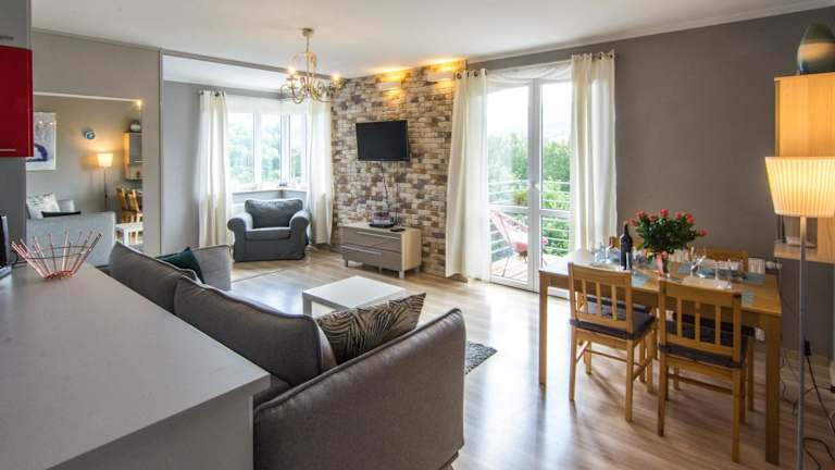 Die Unterkunft verfügt über einen Balkon und einen Sitzbereich. Die Zimmer sind mit einem Flachbild-TV ausgestattet. Eine voll ausgestattete Küche mit Kühlschrank, Geschirrspüler, Herdplatte, Toaster und Wasserkocher ist vorhanden. Ein eigenes Badezimmer mit Dusche und Haartrockner ist ebenfalls vorhanden.