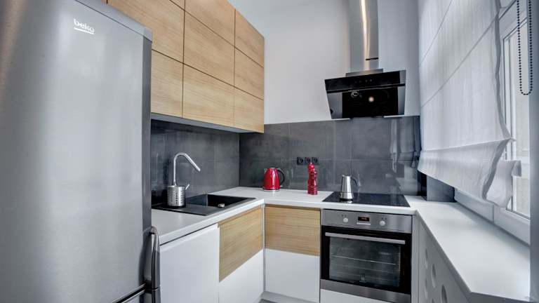 Die Apartments verfügen über eine Küchenzeile, die mit einem Kühlschrank, Geschirrspüler, Ofen, Mikrowelle, Herdplatte sowie Kaffeemaschine und Wasserkocher ausgestattet ist. Dies ermöglicht eine Selbstverpflegung.