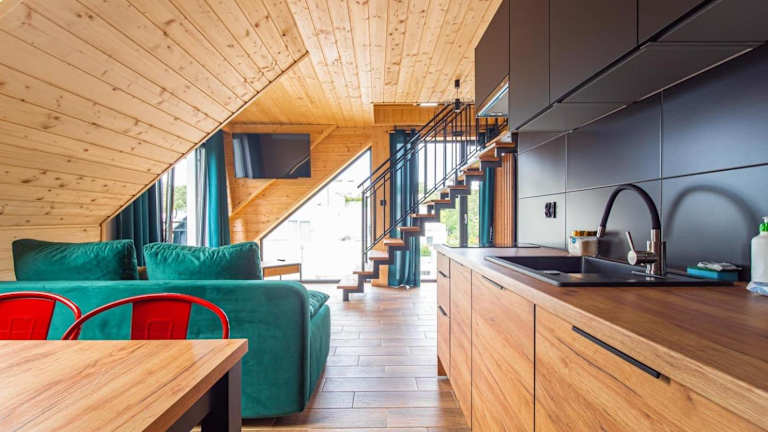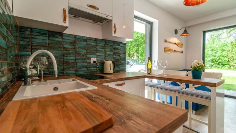 Die Apartments sind mit einer voll ausgestatteten Küche inklusive Kühlschrank, Geschirrspüler, Mikrowelle, Herdplatte, Kaffeemaschine und Wasserkocher ausgestattet.