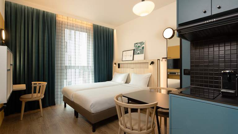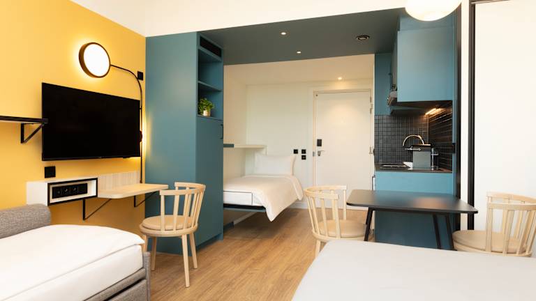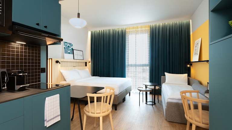 Das Aparthotel bietet täglich ein kontinentales Frühstücksbuffet an (gegen Aufpreis), das sowohl warme als auch kalte Speisen umfasst – ideal für einen gelungenen Start in den Tag. Besonders familienfreundlich: Kinder unter 16 Jahren frühstücken kostenlos, sofern ein erwachsenes Frühstück gebucht wird. Für zusätzlichen Komfort steht im Haus ein praktischer Minimarkt/Convenience‑Shop zur Verfügung, in dem Gäste kleine Mahlzeiten, Snacks und wichtige Grundnahrungsmittel erhalten. Gerade für längere Aufenthalte sind die Studios bestens ausgestattet: Jede Wohneinheit verfügt über eine voll eingerichtete Küche mit Kochfeld, Mikrowelle, Kühlschrank und Geschirr.