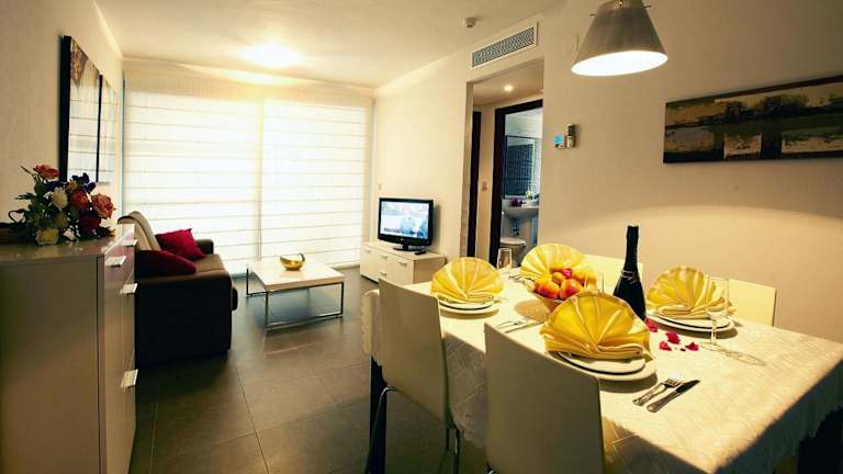 Die Apartments des Aparthotels sind komplett ausgestattet und verfügen über zwei Schlafzimmer, ein Badezimmer, eine voll ausgestattete Küche, ein großes Wohnzimmer und einen Balkon. Jedes Apartment ist klimatisiert, bietet Sat-TV und einen eigenen Safe. Es sind auch Nichtraucherzimmer und Familienzimmer verfügbar.