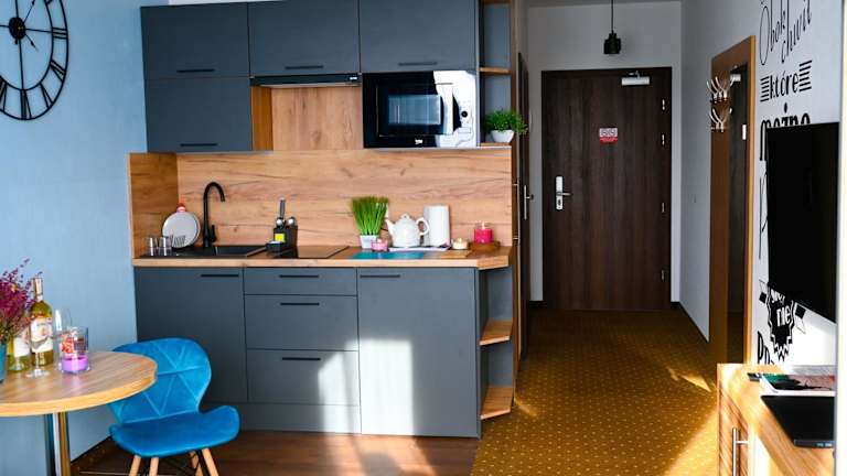 Das ApartHotel Legnica - apartamenty z aneksem kuchennym bietet komfortable Unterkünfte mit moderner Ausstattung. Jedes Zimmer verfügt über einen Flachbild-TV und ein eigenes Bad mit Dusche und kostenlosen Pflegeprodukten. Die Küchenzeile ist mit einem Kühlschrank, einer Mikrowelle und einem Kochfeld ausgestattet, so dass Sie Ihre eigenen Mahlzeiten zubereiten können. Kostenloses WLAN ist ebenfalls verfügbar.