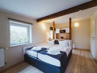 Die Studios und Apartments sind mit einer Küchenzeile ausgestattet sind. Dazu gehören ein Kochfeld, eine Mikrowelle, ein Kühlschrank, eine Kaffeemaschine sowie Geschirr und Besteck.