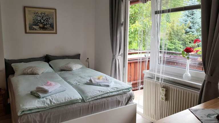 Die Ferienwohnung umfasst 1 Schlafzimmer und ein Wohnzimmer, ausgestattet mit einem Kabel Flachbild-TV. Die Küche ist gut ausgestattet und das Badezimmer verfügt über eine Dusche und eine Badewanne. Handtücher und Bettwäsche werden bereitgestellt. Eine Balkon mit Bergblick runden das Angebot ab.