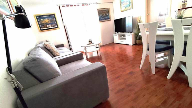 Die Ferienwohnung umfasst zwei Schlafzimmer und ein Badezimmer. Zur Ausstattung gehören Bettwäsche, Handtücher, ein Flachbild-TV mit Satellitenkanälen, ein Essbereich und eine voll ausgestattete Küche. Zudem steht ein Balkon mit Meerblick zur Verfügung.