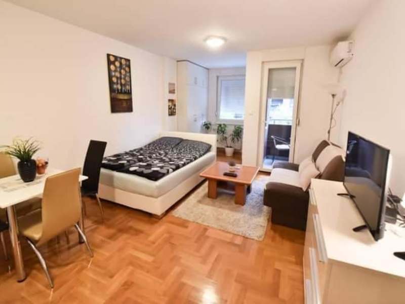 Das klimatisierte Apartment im Apartman Garden ist gemütlich und komfortabel eingerichtet. Es verfügt über ein separates Schlafzimmer, in dem Sie sich nach einem ereignisreichen Tag entspannen können. Die voll ausgestattete Küche bietet Ihnen die Möglichkeit, Ihre eigenen Mahlzeiten zuzubereiten und den Komfort von zu Hause zu genießen. Ein Balkon und eine Terrasse bieten Ihnen die Möglichkeit, die frische Luft und die schöne Aussicht zu genießen. Ein Flachbild-TV sorgt für Unterhaltungsmöglichkeiten im Apartment.