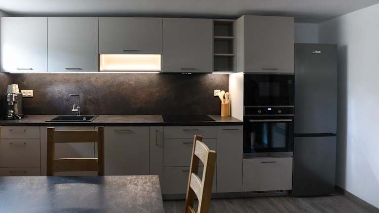 Die Ausstattung der Wohnung umfasst eine voll ausgestattete Küche mit Kühlschrank und Kaffeemaschine, jedoch sind keine spezifischen Informationen zu Verpflegungsmöglichkeiten gegeben.