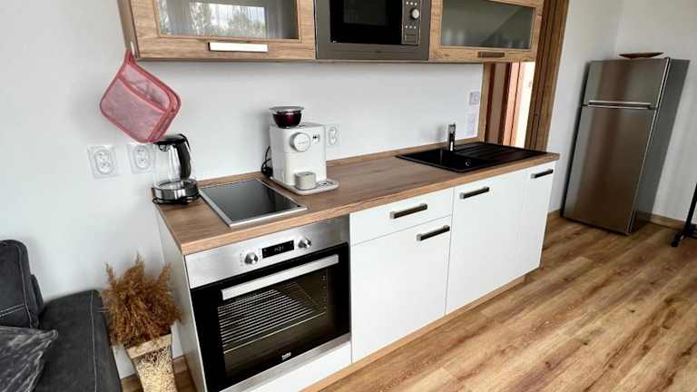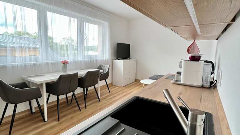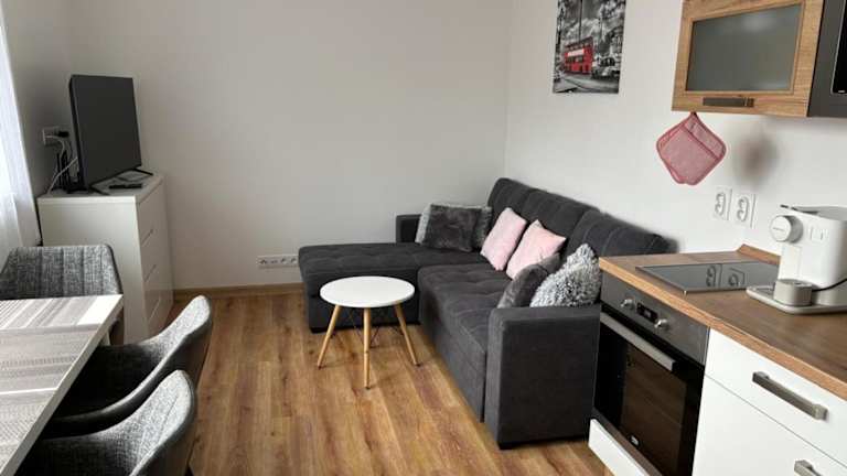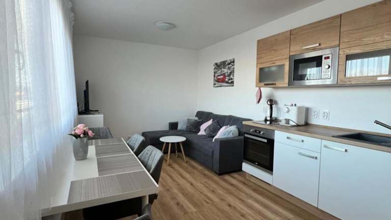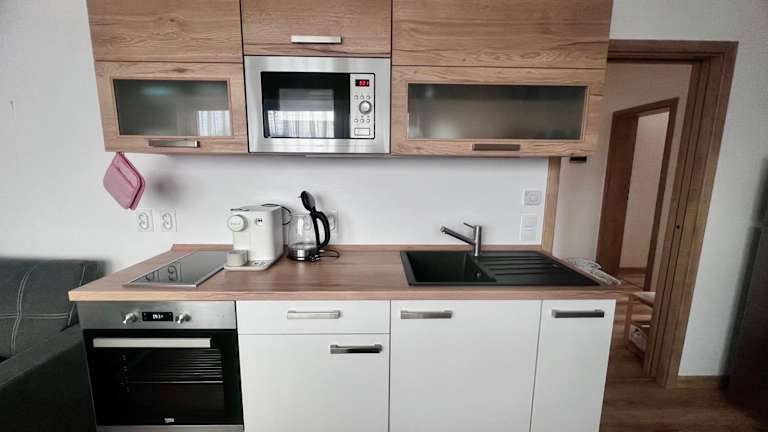 Apartmán Roda2 Malé Lipno bietet Übernachtungsmöglichkeiten in einer Ferienwohnung mit Blick auf den Garten und den See. Die Unterkunft umfasst zwei Schlafzimmer, ein Wohnzimmer sowie eine voll ausgestattete Küche.