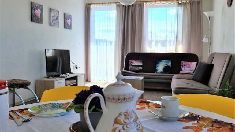 Das Apartment im Apartmán U AKVARISTY verfügt über 2 Schlafzimmer, ein Wohnzimmer und eine voll ausgestattete Küchenzeile mit Kühlschrank und Backofen. Es gibt auch ein Badezimmer mit Badewanne. Vom Balkon aus können Sie den Blick auf den Garten genießen. Handtücher und Bettwäsche werden gestellt, um Ihren Aufenthalt so angenehm wie möglich zu gestalten.