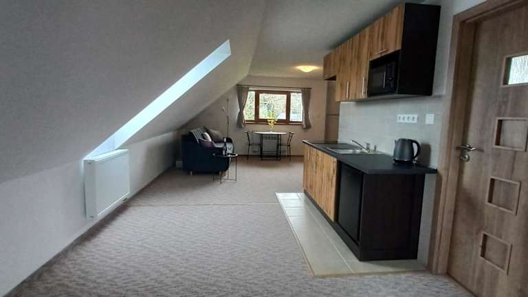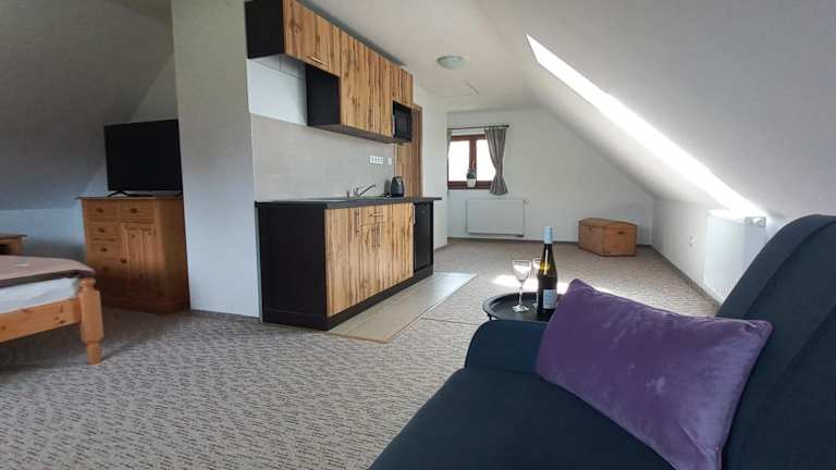 Das Apartment im Apartmán v Jámě verfügt über 1 Schlafzimmer, ein Wohnzimmer und eine Terrasse mit Gartenblick. Die Unterkunft ist mit kostenfreiem WLAN und einem Flachbild-TV ausgestattet. Die Küche ist mit einem Kühlschrank und einer Mikrowelle ausgestattet. Das Badezimmer verfügt entweder über eine Badewanne oder eine Dusche.