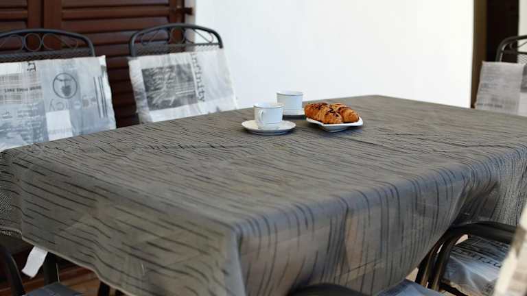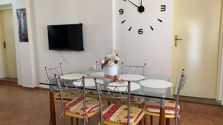 Wohnung fast an der Hauptstraße im ersten Stock mit Terrasse vor dem Eingang und Meerblick, innen alles, was man für einen Urlaub braucht, inklusive Kochnische. sehr nette Gastgeberin