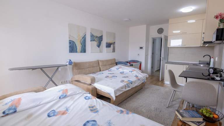 Das Apartment im Apartmani IMPERIAL bietet einen herrlichen Blick auf die Stadt und ist mit Parkettboden, einem Schlafzimmer und einem modernen Badezimmer mit Dusche und Haartrockner ausgestattet. Handtücher und Bettwäsche werden gestellt, um Ihren Aufenthalt so angenehm wie möglich zu gestalten.