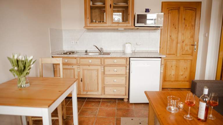 Die Unterkünfte sind mit Parkettböden, einem Flachbild-TV, einer ausgestatteten Küche mit Kühlschrank, Mikrowelle, Herdplatte und Wasserkocher sowie einem eigenen Badezimmer mit Dusche ausgestattet.