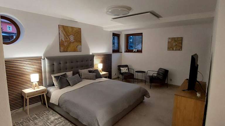Apartmány FELSENBURG Staré Splavy ist eine Unterkunft, die kostenlosen WLAN-Zugang sowie einen privaten Parkplatz anbietet. Die Ausstattung umfasst angenehme Wohneinheiten mit einem Schlafsofa, einem Sitzbereich und einem Flachbild-TV. Jede Einheit verfügt zudem über eine gut ausgestattete Küchenzeile mit einem Essbereich, einen Safe und ein eigenes Badezimmer mit kostenlosen Pflegeprodukten und Haartrockner.