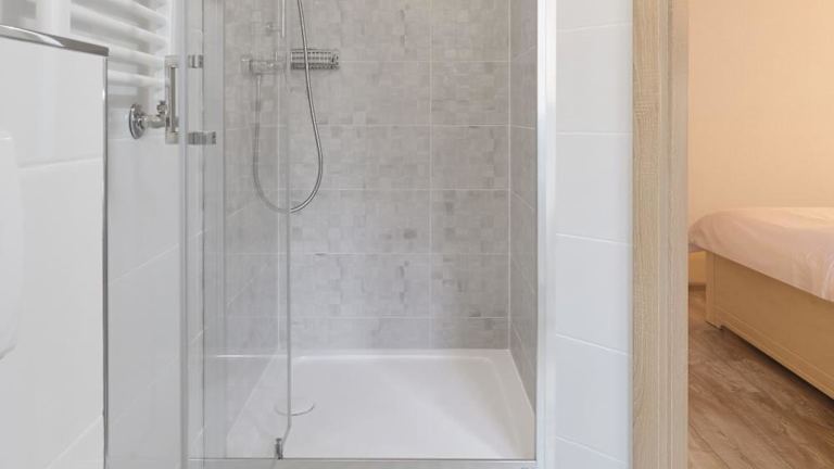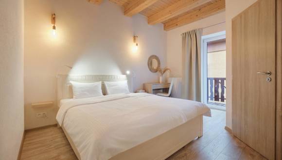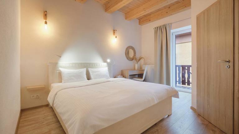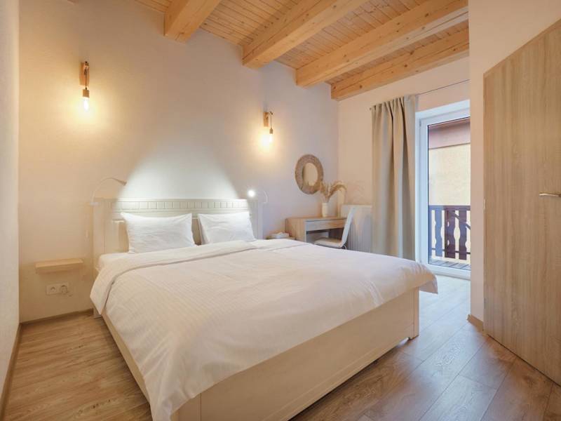 Alle Wohneinheiten verfügen über einen Balkon mit Bergblick und ein eigenes Badezimmer mit Dusche.