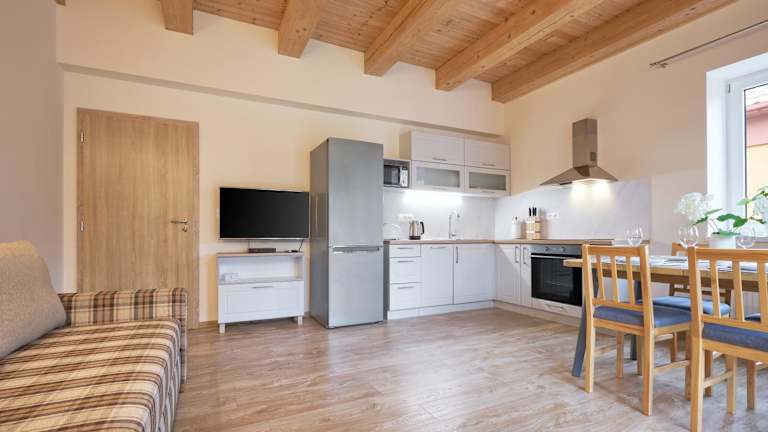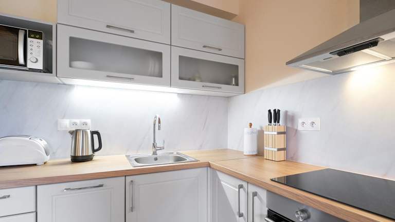 Die Wohneinheiten sind mit einer Küche ausgestattet, die einen Kühlschrank, Geschirrspüler, Ofen, Mikrowelle, Herdplatte und Wasserkocher umfasst.