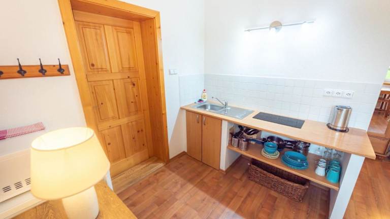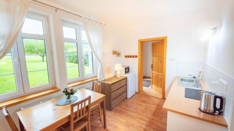 Die Wohneinheiten im Hotel Apartmány Pod Křížovým vrchem Adršpach sind komfortabel und gemütlich eingerichtet. Die Zimmer verfügen über Parkettböden und eine voll ausgestattete Küchenzeile mit einem Kühlschrank, einer Mikrowelle und einem Wasserkocher. Ein Flachbild-TV und ein eigenes Bad mit einer Dusche sind ebenfalls vorhanden.