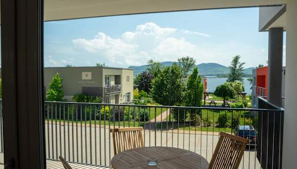 Apartmány Římský vrch bietet klimatisierte Übernachtungsmöglichkeiten mit kostenlosem WLAN und Zugang zu einer Terrasse. Die Unterkunft ist mit einem Flachbild-TV sowie einem eigenen Badezimmer mit Dusche und kostenlosen Pflegeprodukten ausgestattet. Jede Einheit verfügt über einen Balkon mit Blick auf den See.