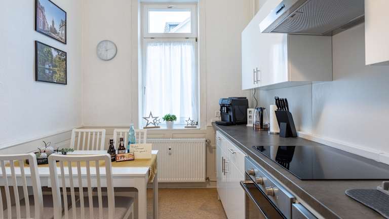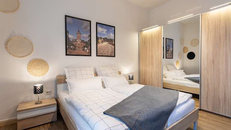 Stilvoll wohnen im Apartment 54 – Ihre Ferienwohnung in Bad Arolsen Das Apartment 54 bietet Ihnen ein modernes und komfortables Zuhause auf Zeit inmitten der charmanten Barockstadt Bad Arolsen. Die stilvoll eingerichtete Ferienwohnung ist ideal für Paare, Alleinreisende oder kleine Familien, die Wert auf Qualität, Ruhe und eine zentrale Lage legen. Raumaufteilung & Ausstattung Die Wohnung umfasst insgesamt 60 m² und bietet folgende Räumlichkeiten: Separates Schlafzimmer mit hochwertigem Doppelbett, gemütlicher Beleuchtung und ausreichend Stauraum. Großzügiges Wohnzimmer mit Sofa, Smart-TV, Essbereich und Zugang zum Balkon – ideal zum Entspannen nach einem erlebnisreichen Tag. Voll ausgestattete Küche mit Kühlschrank, Kaffeemaschine, Herd, Backofen und allen nötigen Küchenutensilien für Selbstversorger. Modernes Badezimmer mit Badewanne, WC, Waschbecken und kostenlosen Pflegeprodukten. Handtücher und Bettwäsche sind inklusive. Flur mit Garderobe und Spiegel für einen angenehmen Empfangsbereich. Ein besonderes Highlight ist der ca. 19 m² große Balkon, der zum Frühstücken im Freien oder zum Sonnenuntergang genießen einlädt. Komfort & Extras Garage mit Wallbox für Elektrofahrzeuge – nachhaltiges Reisen leicht gemacht. Late Check-out möglich – für maximale Entspannung. 100 % Naturstrom – umweltfreundlich und verantwortungsbewusst. Kostenfreies WLAN, Smart-TV und moderne Heiztechnik sorgen für zeitgemäßen Komfort.