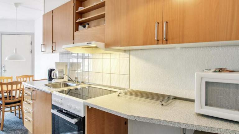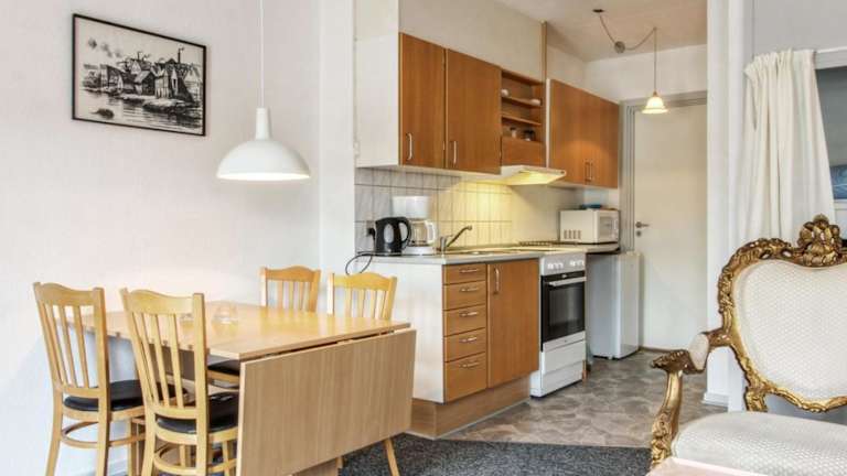 Die Ferienwohnung beinhaltet ein Schlafzimmer, ein Wohnzimmer mit Fernseher und eine voll ausgestattete Küche, die mit einem Kühlschrank und einem Ofen ausgestattet ist. Zudem gibt es ein Badezimmer mit Dusche. Handtücher, Bettwäsche und Wäsche werden gemäß den Richtlinien der örtlichen Behörden gewaschen.