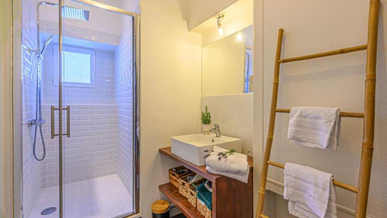 Die Wohnung hat ein Schlafzimmer und ist ausgestattet mit einer Küchenzeile, die einen Kühlschrank und einen Geschirrspüler beinhaltet. Das Badezimmer verfügt über eine Dusche und einen Haartrockner. Ein TV ist ebenfalls vorhanden.