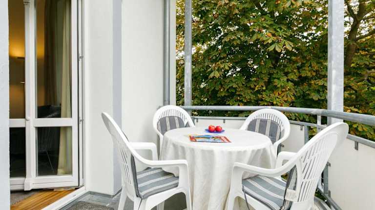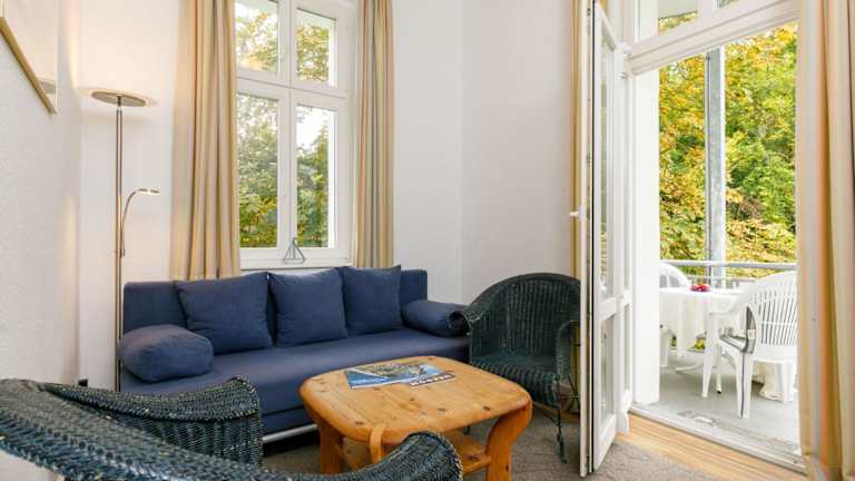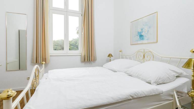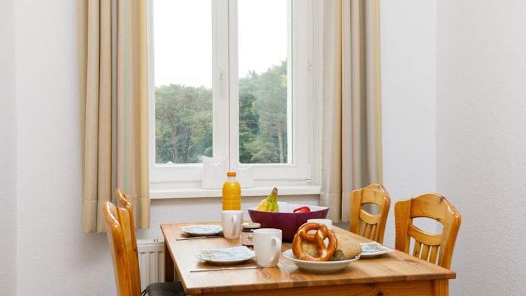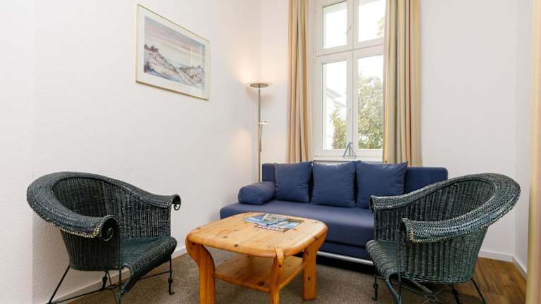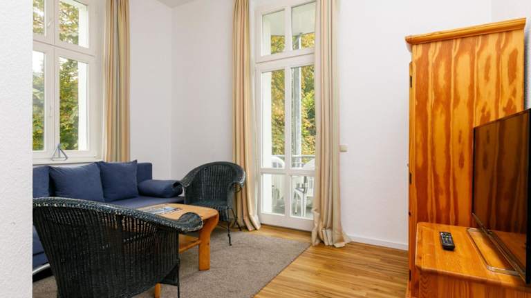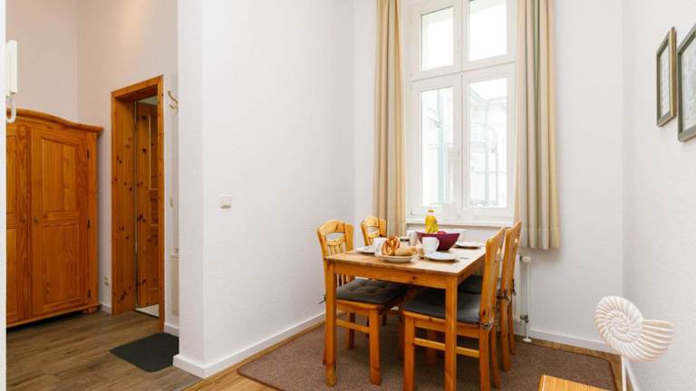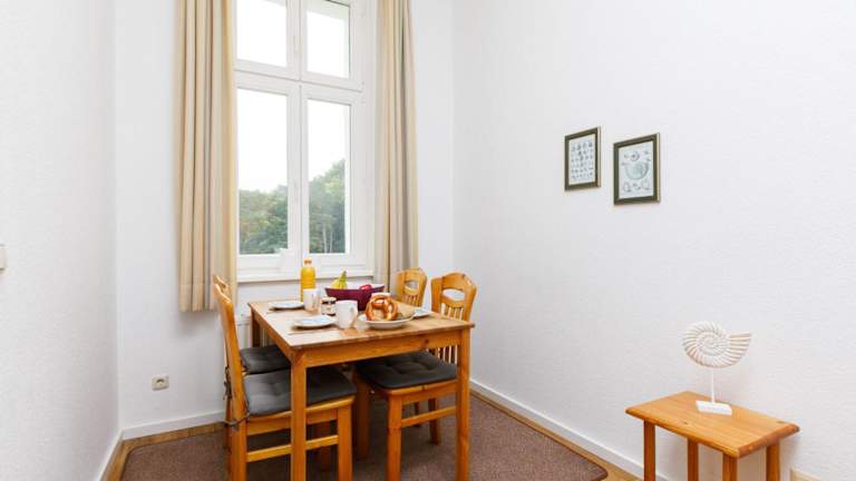 Die Ferienwohnung ist mit einem Wohnzimmer ausgestattet, das über einen TV mit Kabelkanälen verfügt. Eine voll ausgestattete Küchenzeile mit einem Kühlschrank und einem Geschirrspüler ist ebenfalls vorhanden. Das Badezimmer ist mit einer Badewanne ausgestattet. Zusätzlich kann ein Babybett kostenfrei bereitgestellt werden. Für die Vermietung von Bettwäsche wird ein Preis von 22 EUR erhoben, eine eigene Mitnahme ist möglich.