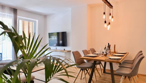 Die Ferienwohnung verfügt über zwei Schlafzimmer, eine Küche mit Kühlschrank und Geschirrspüler, ein Wohnzimmer mit Flachbild-TV und einen Sitzbereich. Ein Badezimmer mit Dusche ist ebenfalls vorhanden. Handtücher und Bettwäsche werden bereitgestellt.