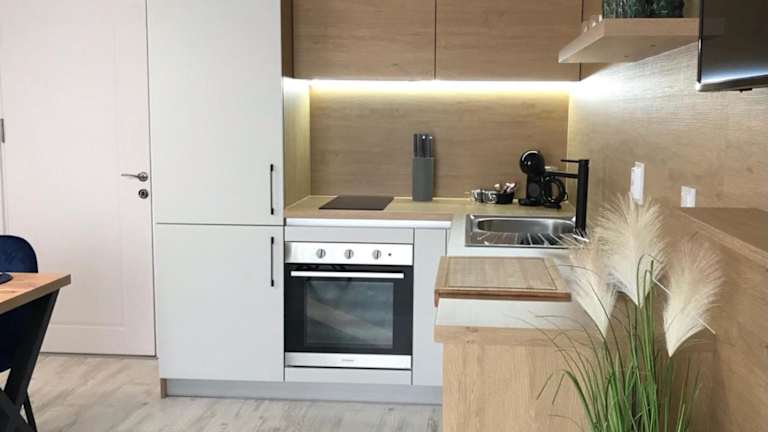 Die Ferienwohnung verfügt über ein Schlafzimmer und ein Wohnzimmer. Sie ist mit einer Klimaanlage, einer voll ausgestatteten Küche, einem Kühlschrank und einer Kaffeemaschine eingerichtet. Zudem gibt es ein Badezimmer mit einer Dusche und einem Haartrockner. Handtücher und Bettwäsche werden bereitgestellt.