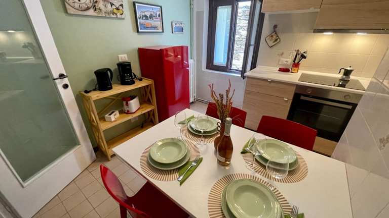 Die Ferienwohnung verfügt über eine voll ausgestattete Küche mit einem Kühlschrank und einer Kaffeemaschine, in der die Gäste ihre eigenen Mahlzeiten zubereiten können.