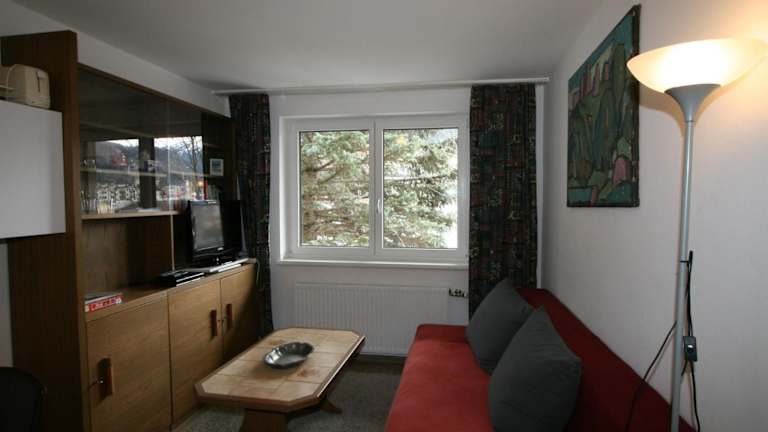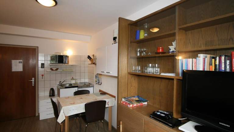 Die Ferienwohnung umfasst ein Schlafzimmer, ein Wohnzimmer, einen Fernseher sowie eine gut ausgestattete Küchenzeile mit Kühlschrank und Ofen. Außerdem ist ein Badezimmer mit Dusche vorhanden. Eine Terrasse ergänzt die Ausstattung und bietet Bergblick.