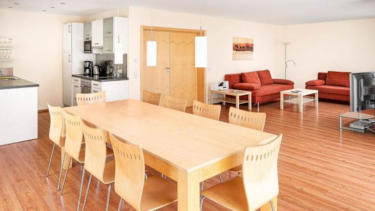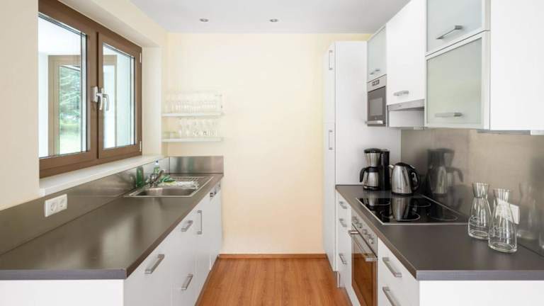 Die Ferienwohnung verfügt über eine Küchenzeile, die mit einem Kühlschrank, einem Geschirrspüler, einem Ofen, einer Kaffeemaschine und einem Wasserkocher ausgestattet ist.