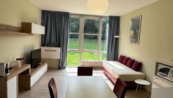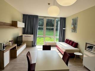 Die Ferienwohnung besteht aus einem Schlafzimmer und einem Badezimmer, welches mit modernen Annehmlichkeiten wie einem Bidet, einer Dusche und einem Haartrockner ausgestattet ist. Des Weiteren verfügt die Unterkunft über einen Sitzbereich, einen Essbereich sowie eine vollständig eingerichtete Küchenzeile mit Kühlschrank, Ofen und Mikrowelle.