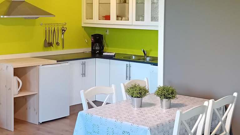 Die Ferienwohnung verfügt über zwei Schlafzimmer sowie eine voll ausgestattete Küche, die mit einem Kühlschrank und einem Geschirrspüler ausgestattet ist. Des Weiteren gibt es ein Badezimmer mit Dusche, Haartrockner und Waschmaschine. Handtücher und Bettwäsche werden bereitgestellt.
