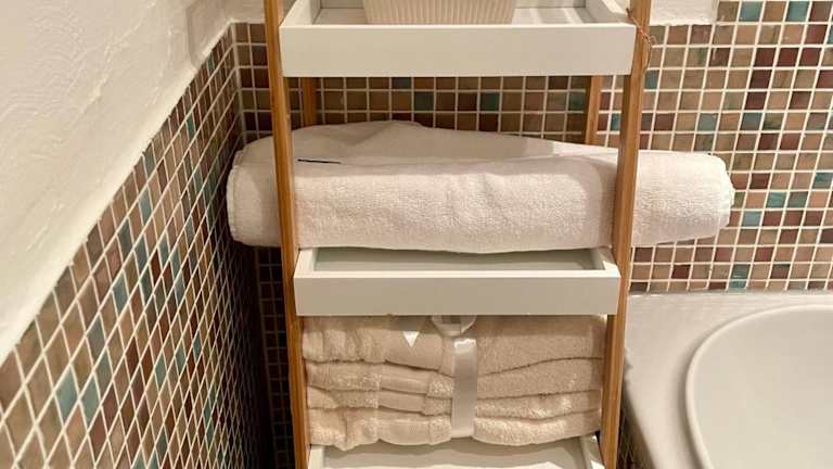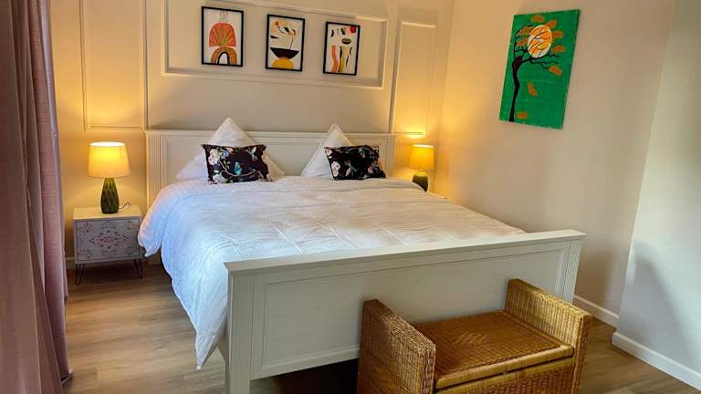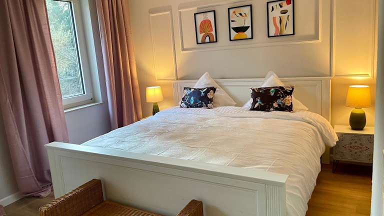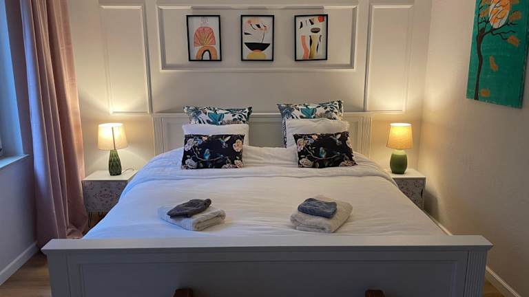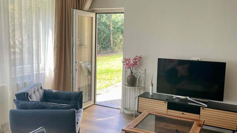 Die Ferienwohnung umfasst ein Schlafzimmer, ein Wohnzimmer mit Flachbild-TV, eine gut ausgestattete Küche mit Kühlschrank und Geschirrspüler sowie ein Badezimmer mit Dusche. Handtücher und Bettwäsche werden bereitgestellt. Die Aussicht von der Terrasse und dem Garten ist besonders hervorzuheben.