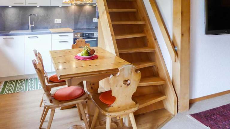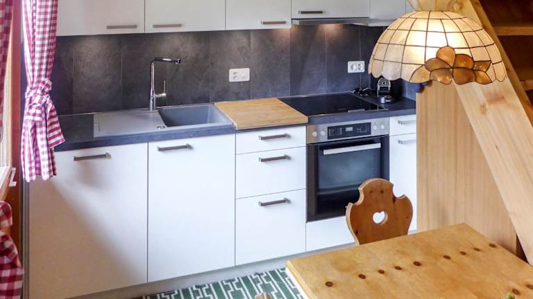 Die Ferienwohnung verfügt über einen Balkon mit Bergblick, einen Fernseher, eine gut ausgestattete Küche mit Kühlschrank, Geschirrspüler und Ofen sowie ein Badezimmer mit Dusche und Haartrockner.