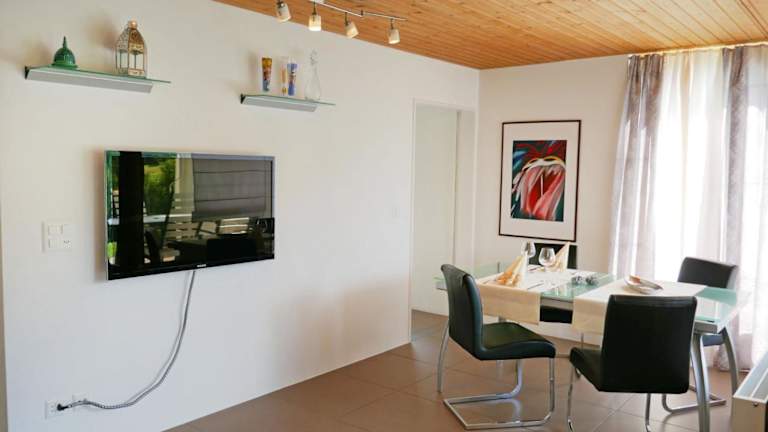 Die Ferienwohnung verfügt über ein Schlafzimmer, ein Wohnzimmer, einen TV und eine gut ausgestattete Küche mit Kühlschrank und Geschirrspüler. Es gibt auch ein Badezimmer mit Badewanne sowie eine Veranda/Patiobereich mit Bergblick.