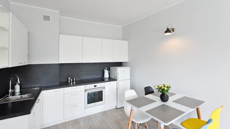 Das Apartment bietet ein helles und geräumiges Wohnzimmer mit deckenhohen Balkonfenstern. Hier können Sie auf dem bequemen weißen Ledersofa mit einem hölzernen Wohnzimmertisch entspannen. Die Küchenzeile ist komplett ausgestattet und verfügt über einen Herd, einen Backofen und sogar eine Spülmaschine. Der Essbereich ist ideal, um Ihre eigenen Mahlzeiten zu genießen. Kostenloses WLAN ist ebenfalls verfügbar.