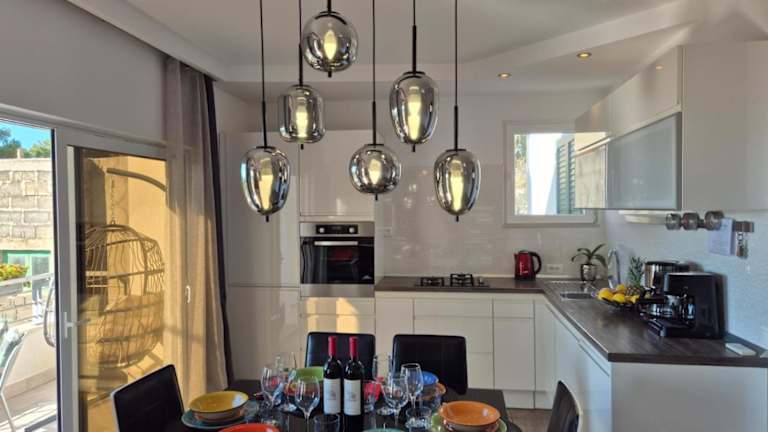Die Unterkunft verfügt über eine gut ausgestattete Küche mit Kühlschrank und Geschirrspüler, jedoch sind keine spezifischen Verpflegungsoptionen angegeben.