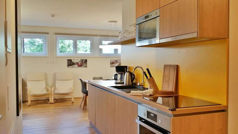 Die Ferienwohnung besteht aus 2 Schlafzimmern, einem Wohnzimmer und einer voll ausgestatteten Küche mit Kühlschrank und Kaffeemaschine. Ein Badezimmer mit Dusche und Haartrockner ist ebenfalls vorhanden. Zudem gibt es einen Fernseher mit Satellitenkanälen.