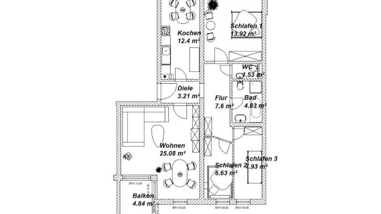 Die Ferienwohnung ist ausgestattet mit drei Schlafzimmern, einem Badezimmer, Bettwäsche, Handtüchern, einem Flachbild-TV mit Satellitenkanälen, einem Essbereich, einer voll ausgestatteten Küche und einem Balkon mit Gartenblick.