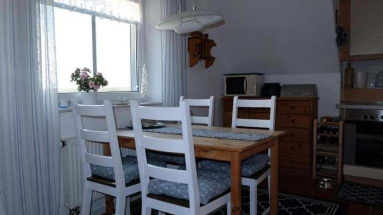 Die Ferienwohnung bietet eine gut ausgestattete Küchenzeile mit Kühlschrank, Ofen und Mikrowelle, jedoch sind keine spezifischen Verpflegungsmöglichkeiten erwähnt.