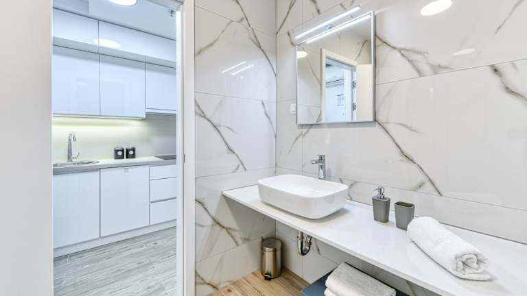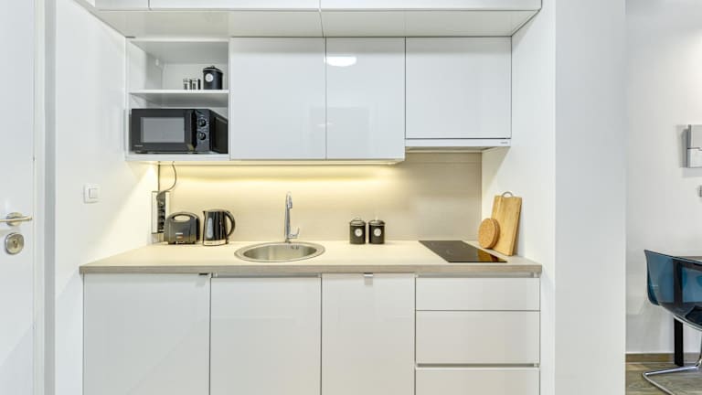 In der Unterkunft ist eine voll ausgestattete Küche vorhanden, die mit einem Kühlschrank, Geschirrspüler und Mikrowelle versehen ist. Das Apartment bietet alle notwendigen Kochmöglichkeiten für einen angenehmen Aufenthalt.