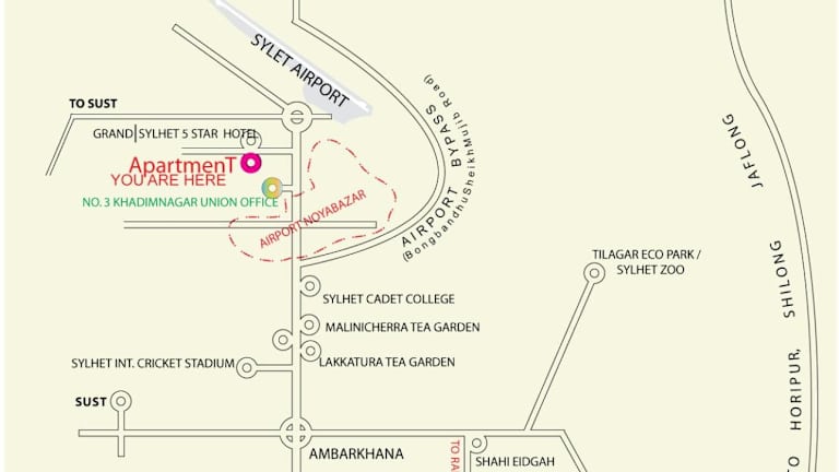 Die Unterkunft befindet sich in Sylhet, lediglich 1 km vom Flughafen Osmani International entfernt. Die Lage ermöglicht einen einfachen Zugang zu den umliegenden Attraktionen der Region.