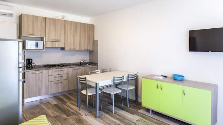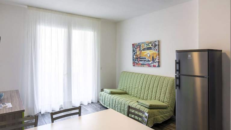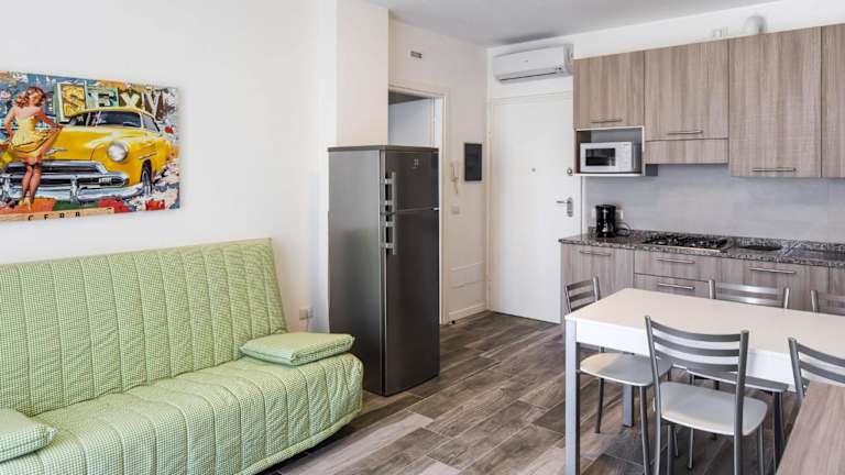 Das Apartment besteht aus zwei Schlafzimmern, einem Wohnzimmer und einer voll ausgestatteten Küchenzeile, die einen Kühlschrank und eine Kaffeemaschine beinhaltet. Des Weiteren verfügt das Apartment über ein Badezimmer mit Bidet und Dusche sowie einen TV mit Satellitenkanälen. Zusatzservices wie die Anmietung von Handtüchern und Bettwäsche sind möglich, und es kann ein Babybett bereitgestellt werden.