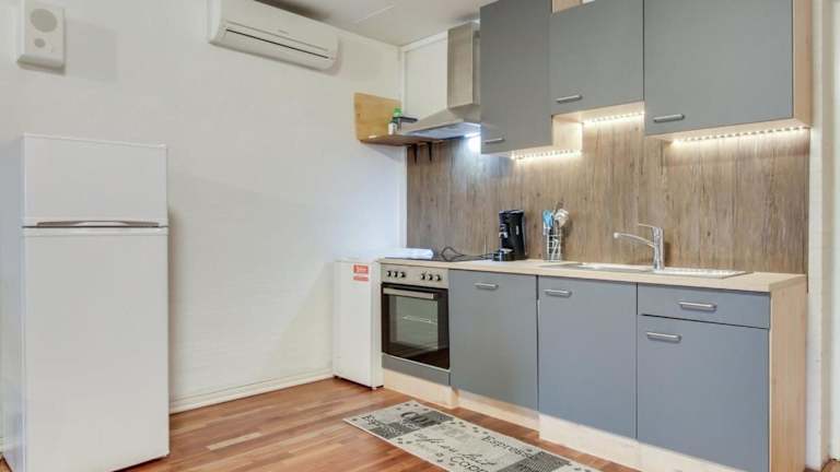 Es gibt eine gut ausgestattete Küche mit Kühlschrank, Geschirrspüler und Ofen, die den Gästen zur Verfügung steht.