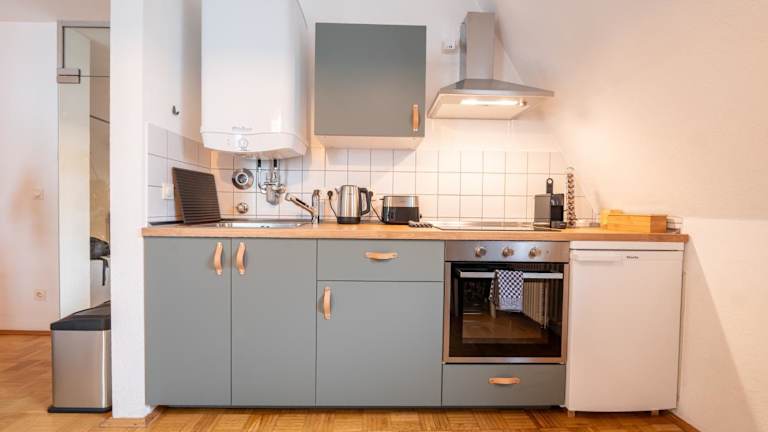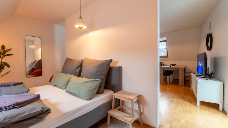 Das Apartment verfügt über ein Schlafzimmer, eine Küche mit Kühlschrank und Ofen, ein Badezimmer mit Dusche sowie einen Sitzbereich. Zur Ausstattung gehören zudem ein Flachbild-TV, Handtücher und Bettwäsche.