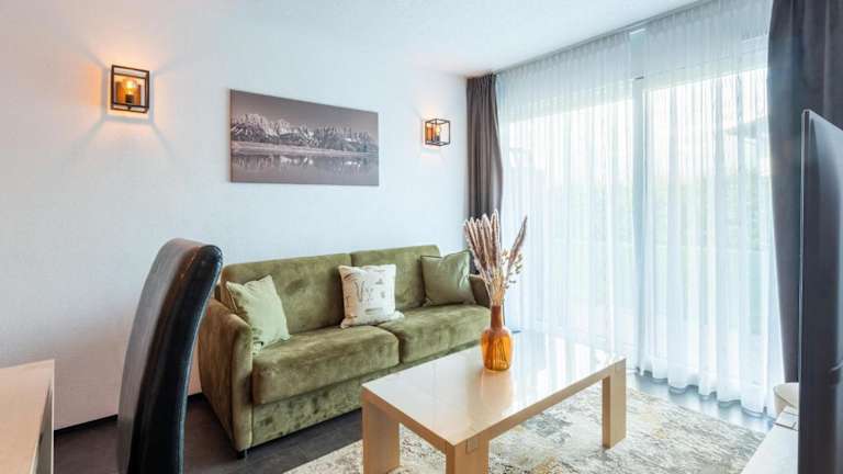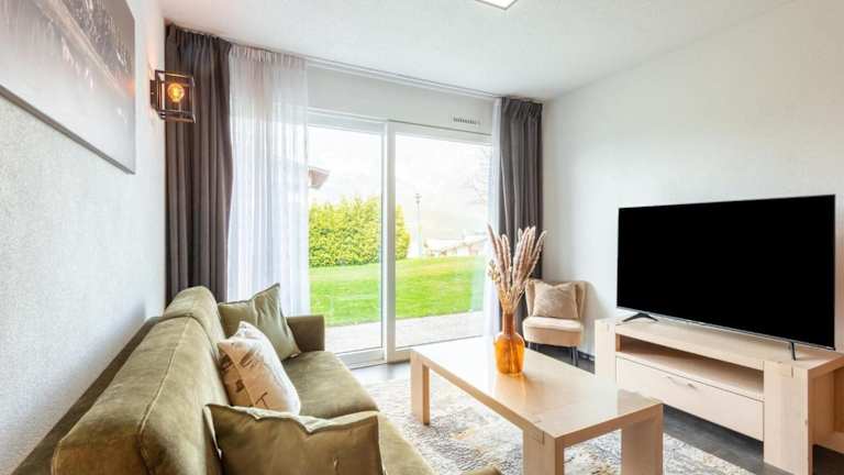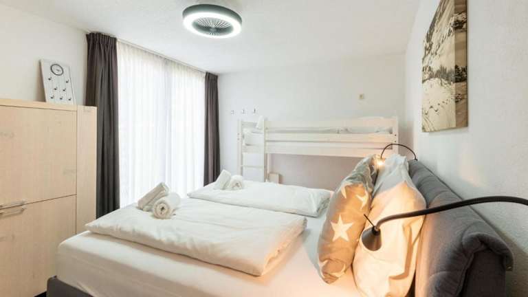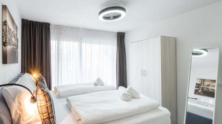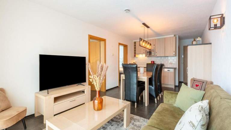 Die Ferienwohnung umfasst zwei Schlafzimmer, ein Wohnzimmer, eine gut ausgestattete Küche mit Kühlschrank und Geschirrspüler sowie zwei Badezimmer mit Dusche. Bettwäsche und Handtücher werden bereitgestellt.